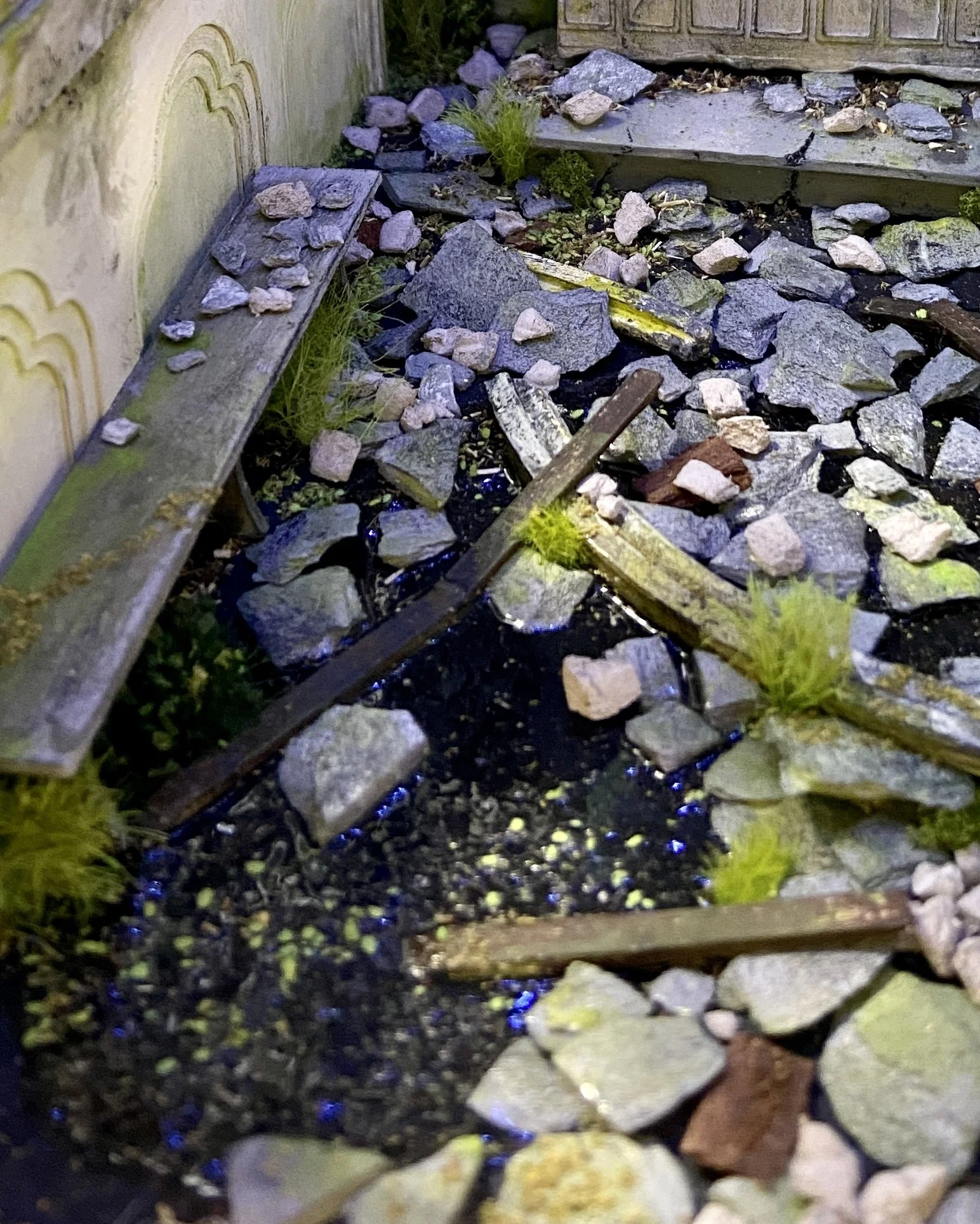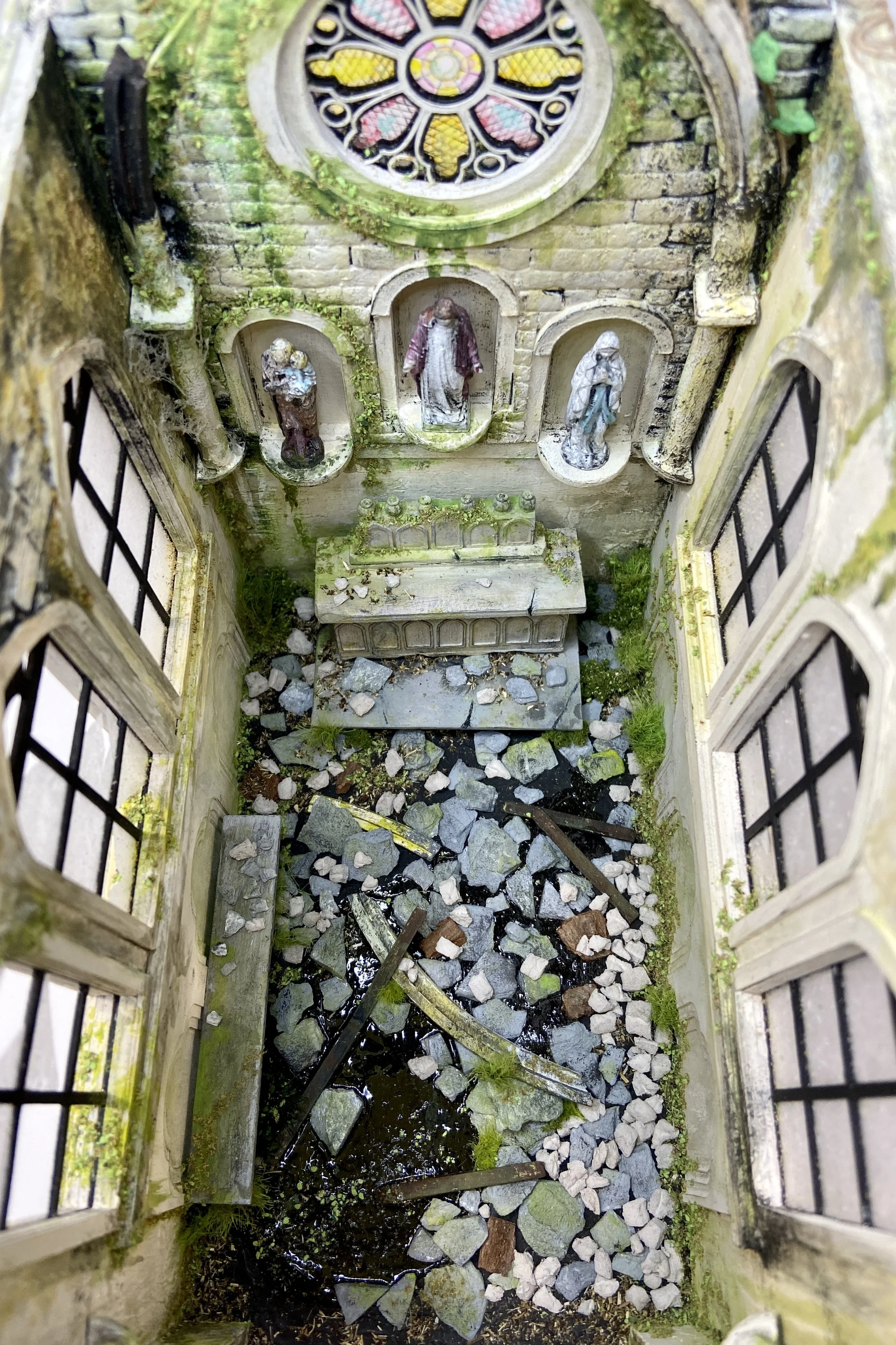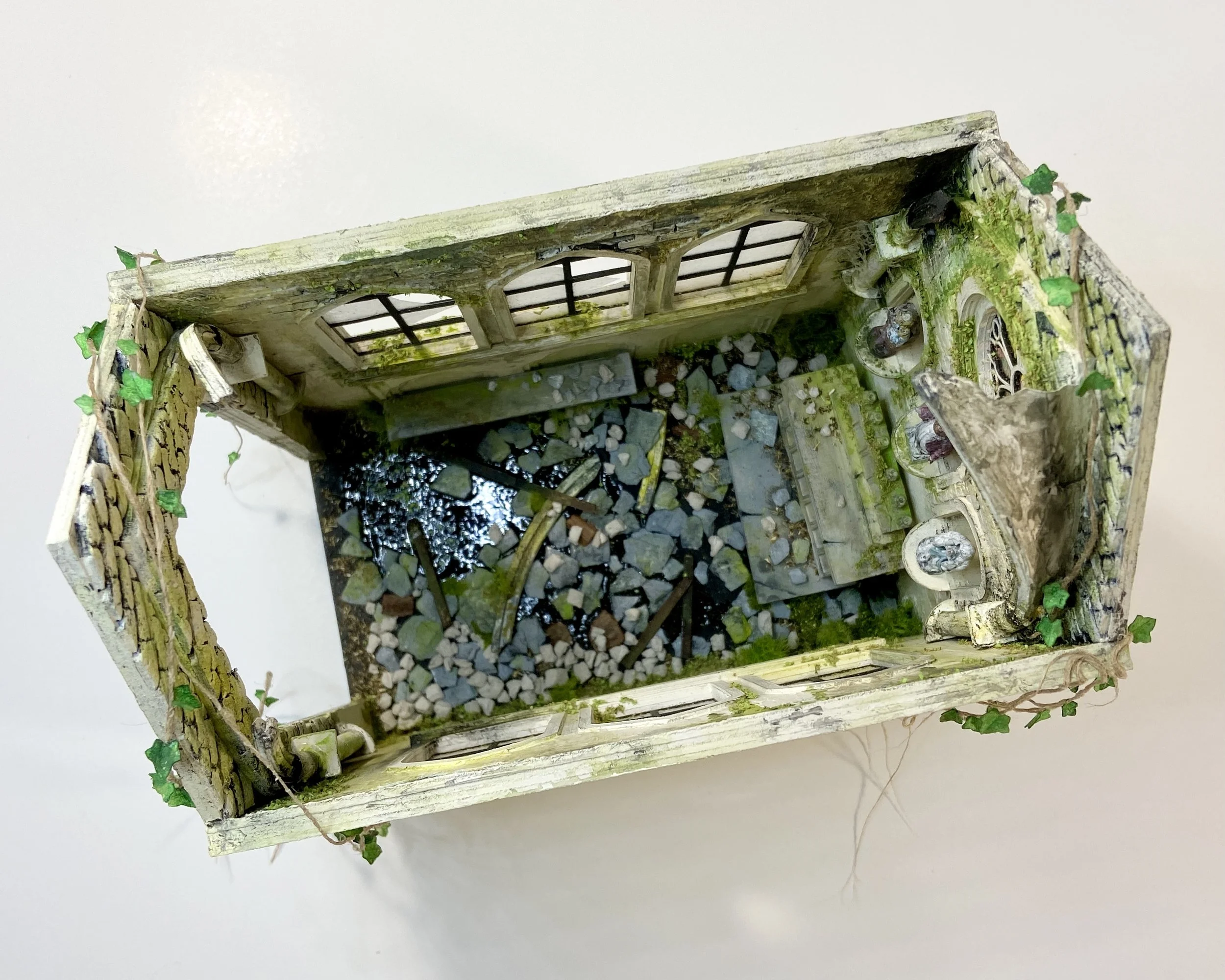 Materials: Chipboard, foam board, card stock, acetate sheet, LEDs, modeling paste, resin, moss, twine, acrylic paint