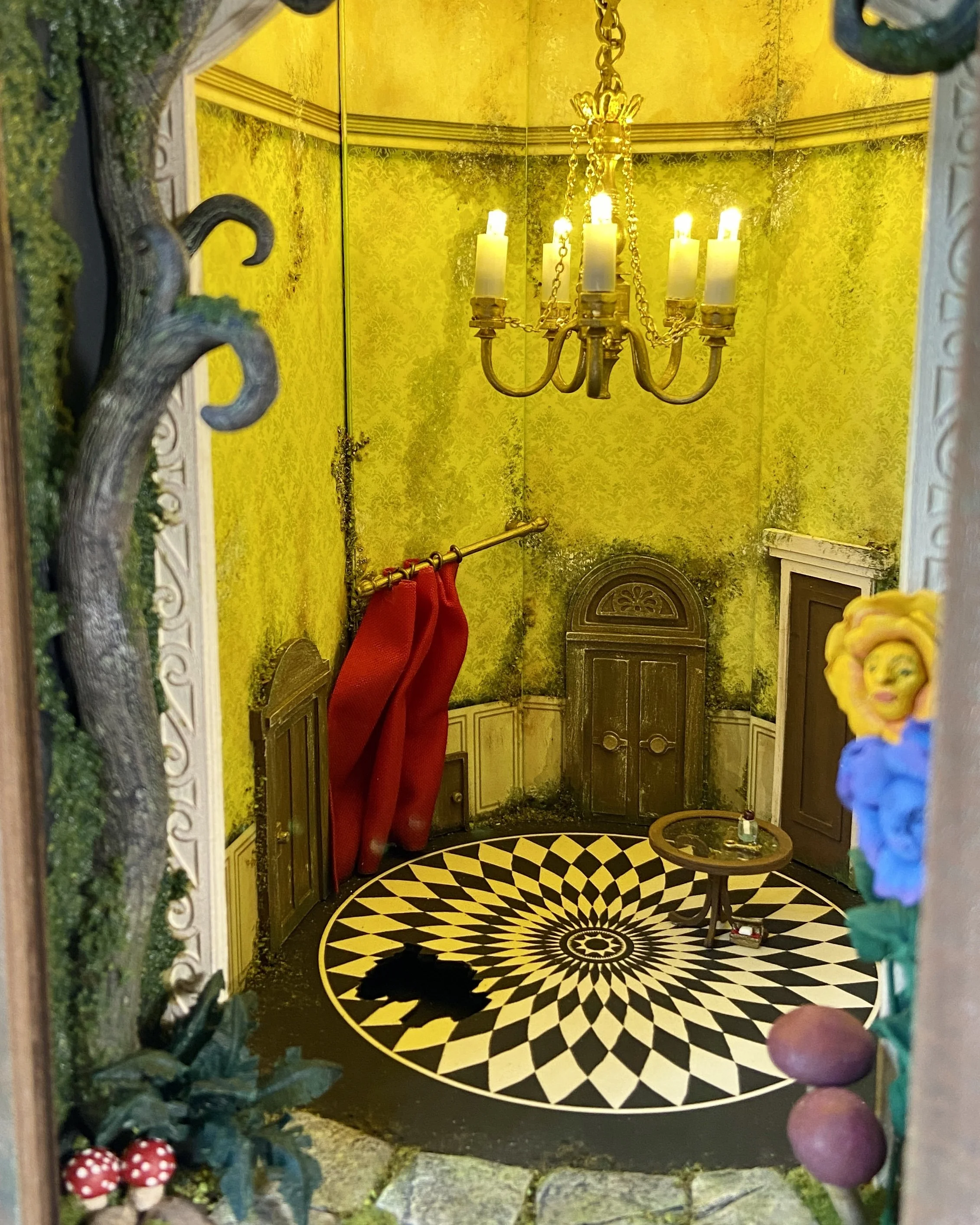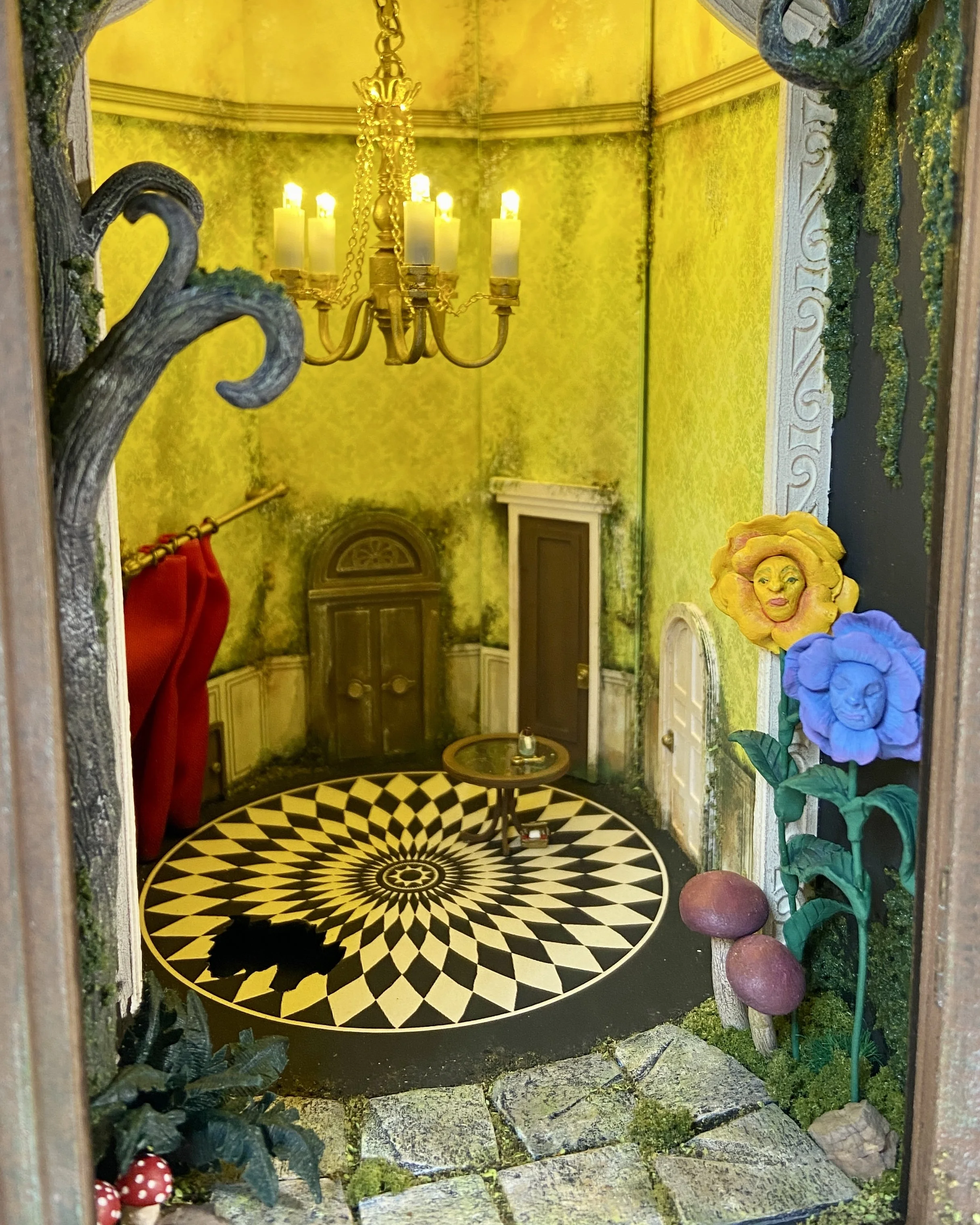 Materials: Wood, chipboard, cardstock, paper, foam sheet, acrylic paints, LEDs, fabric, beads, Cosclay polymer clay, Woodland Scenics turfs and bushes