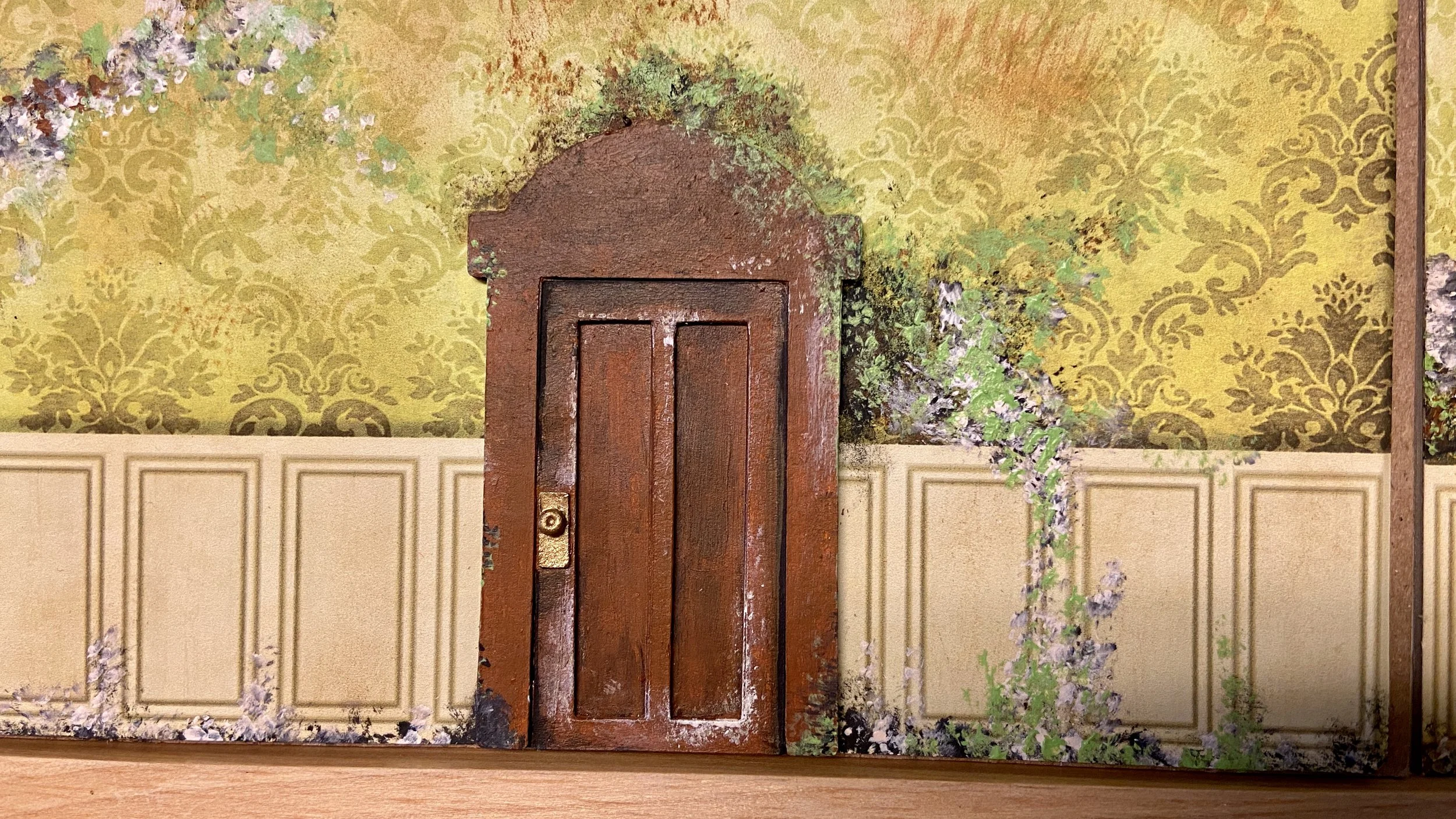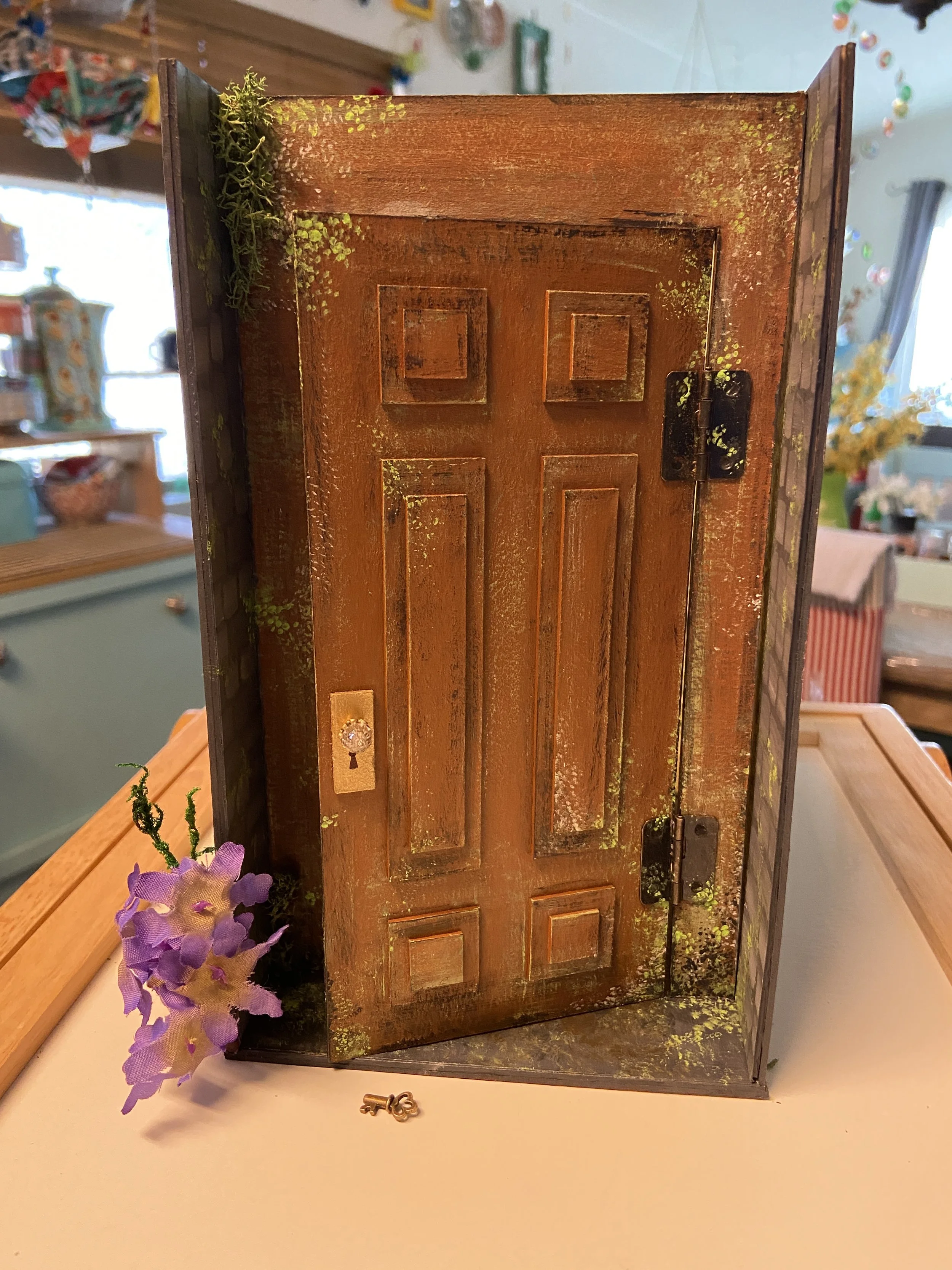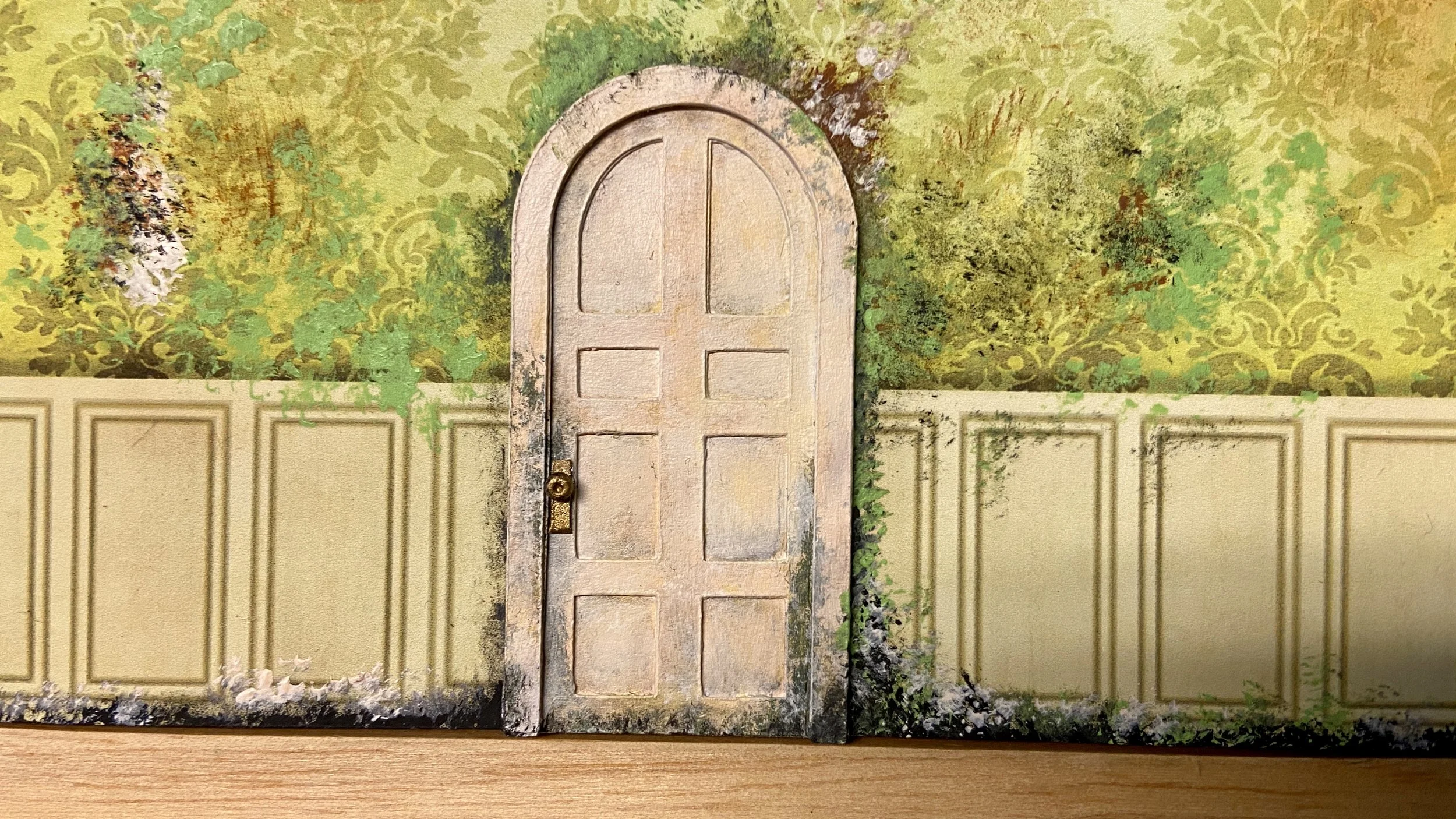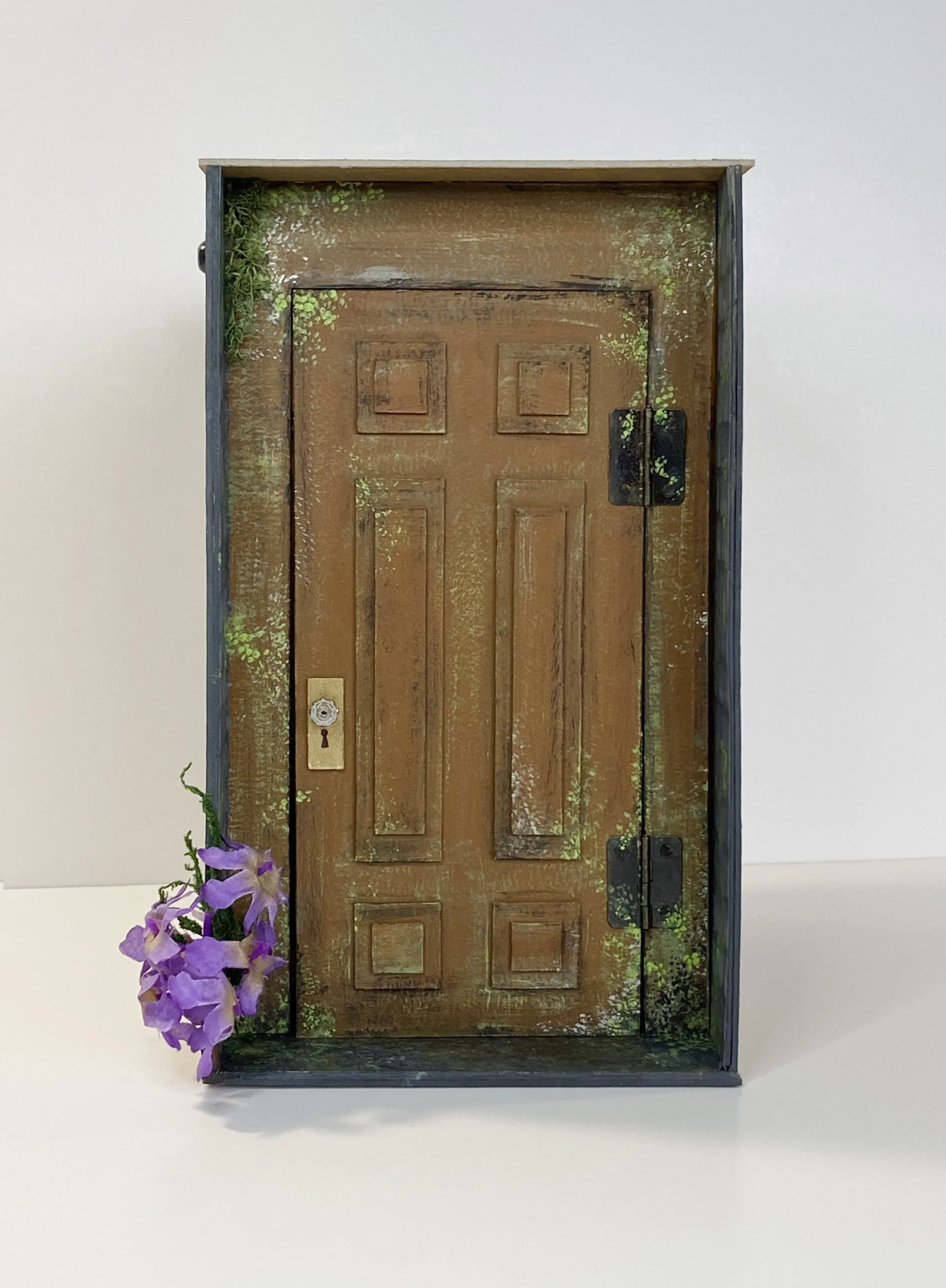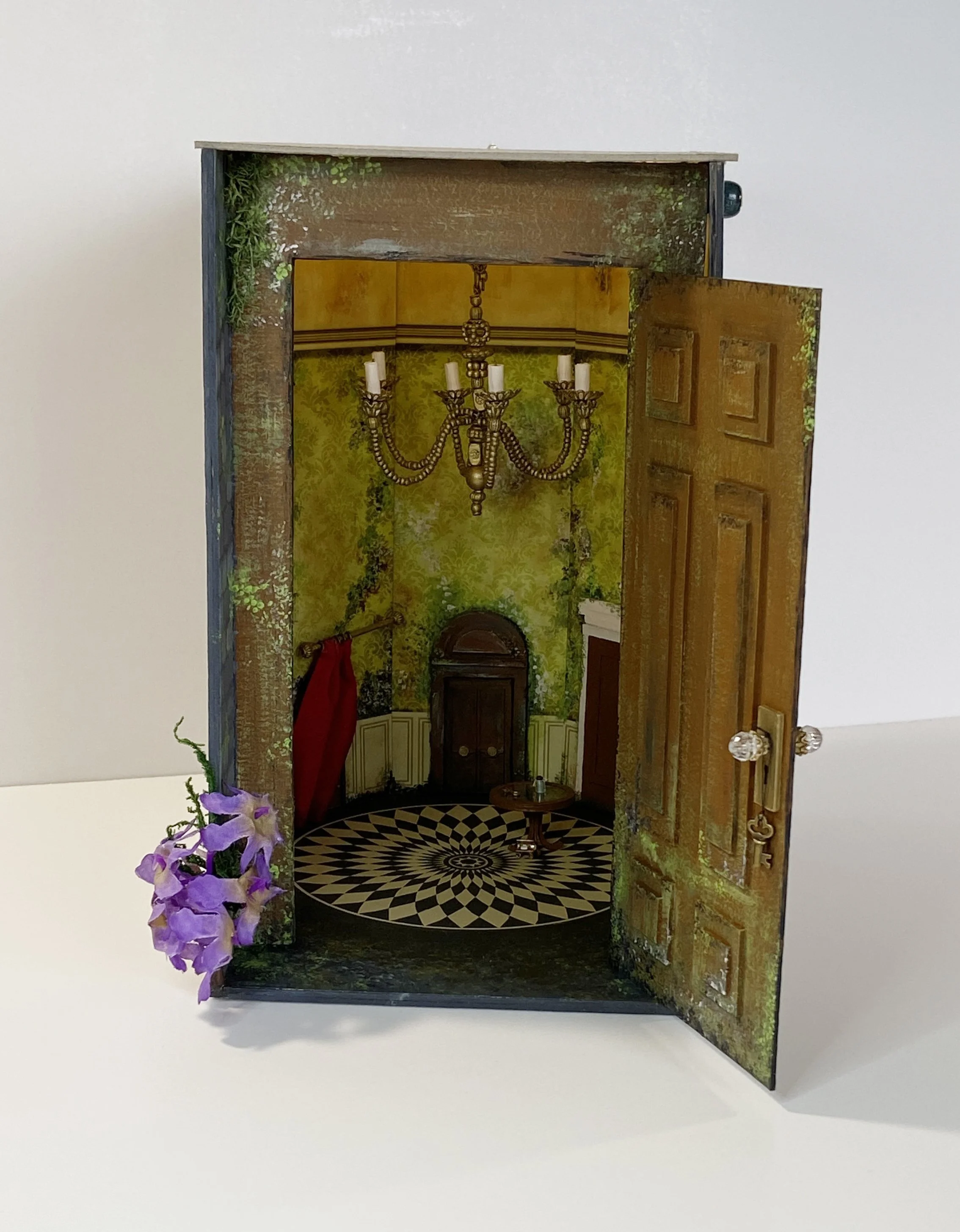 Materials: Chipboard, card stock, LEDs, modeling paste, polymer clay, beads, moss, fabric, acrylic paint