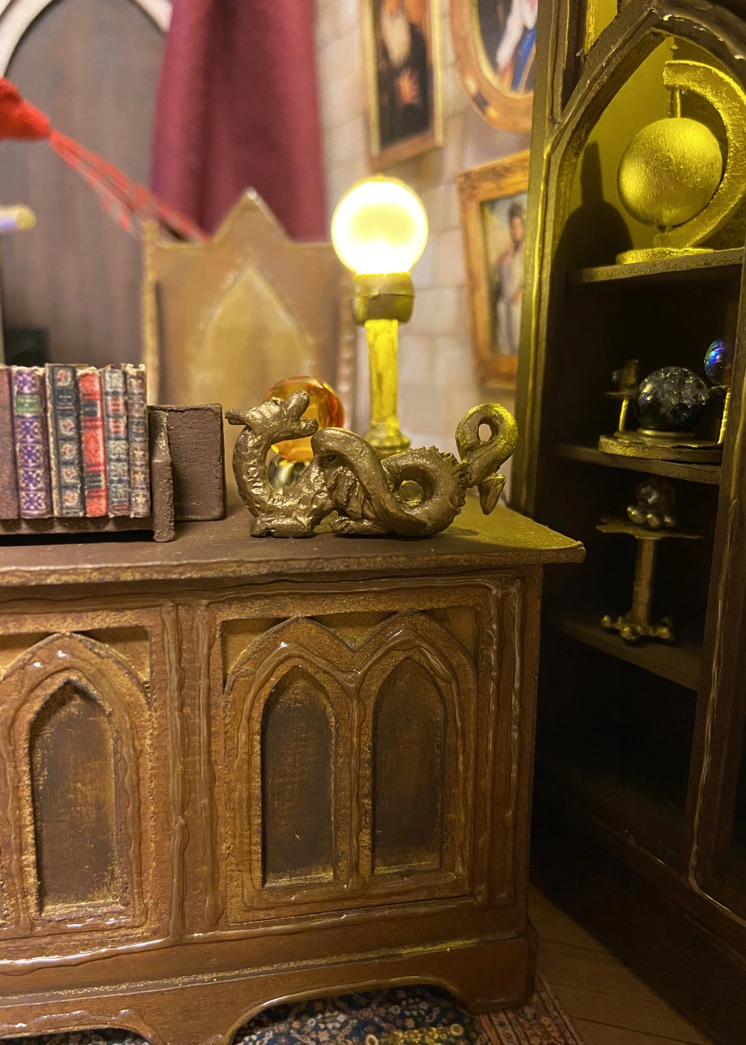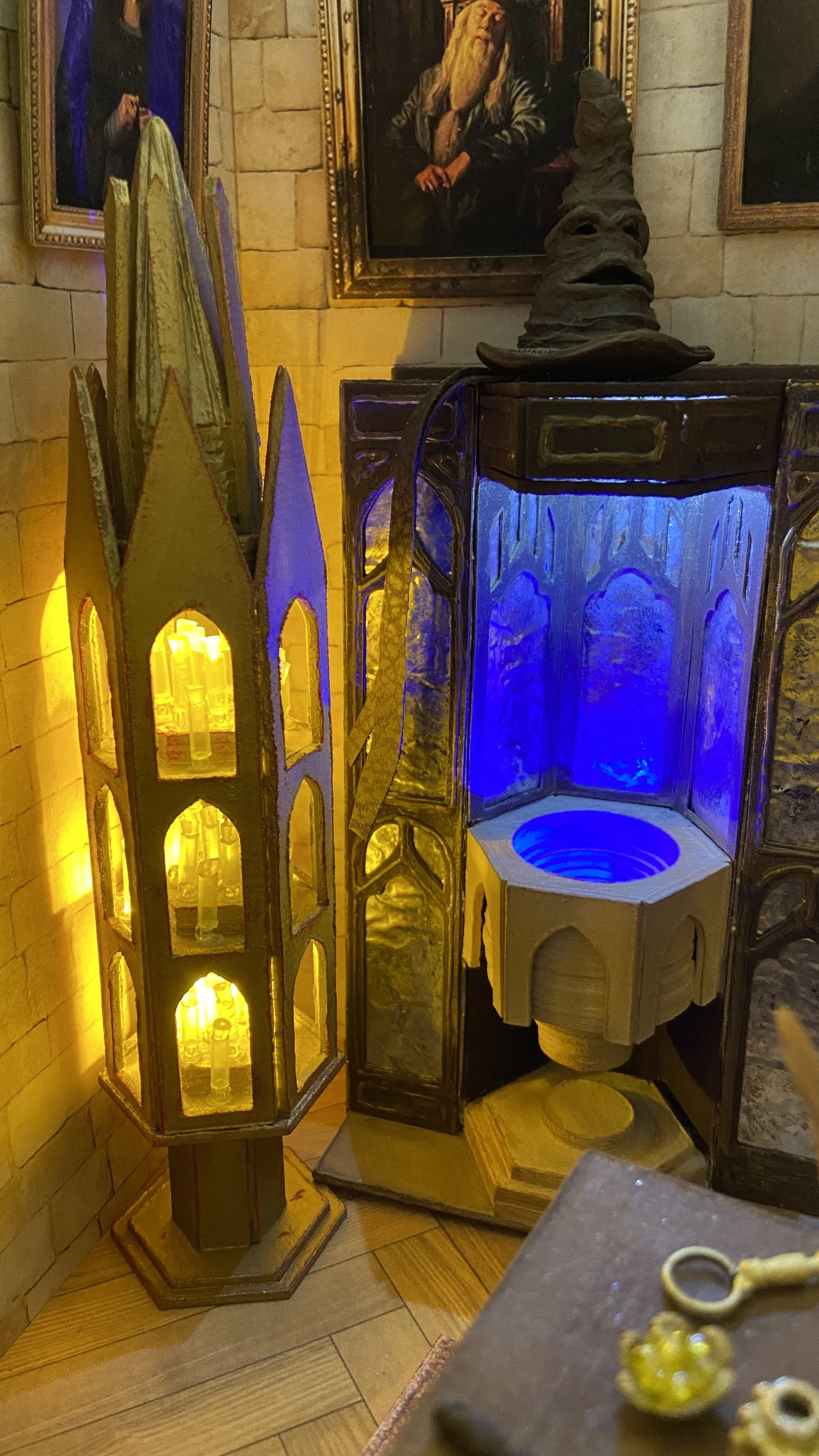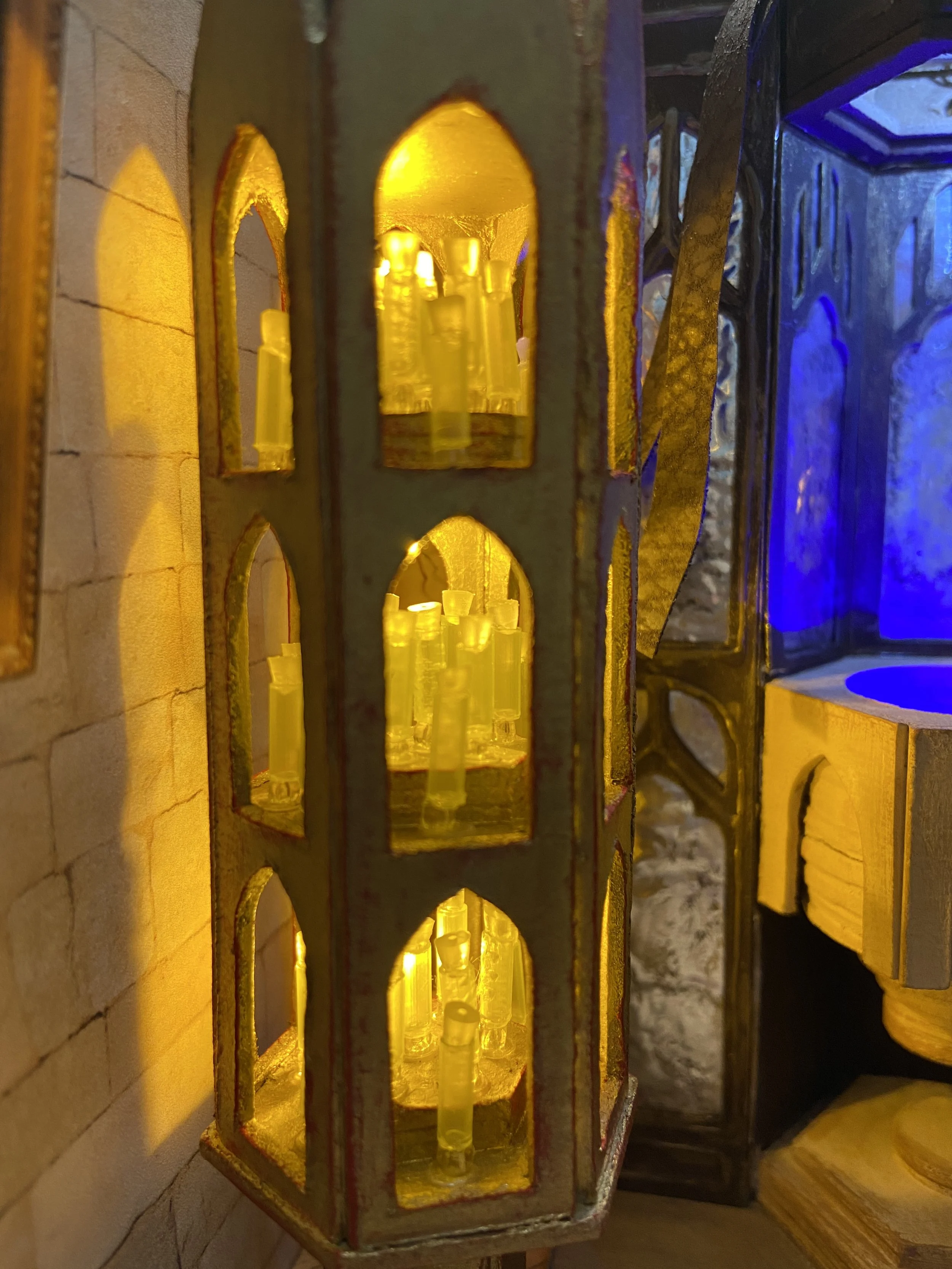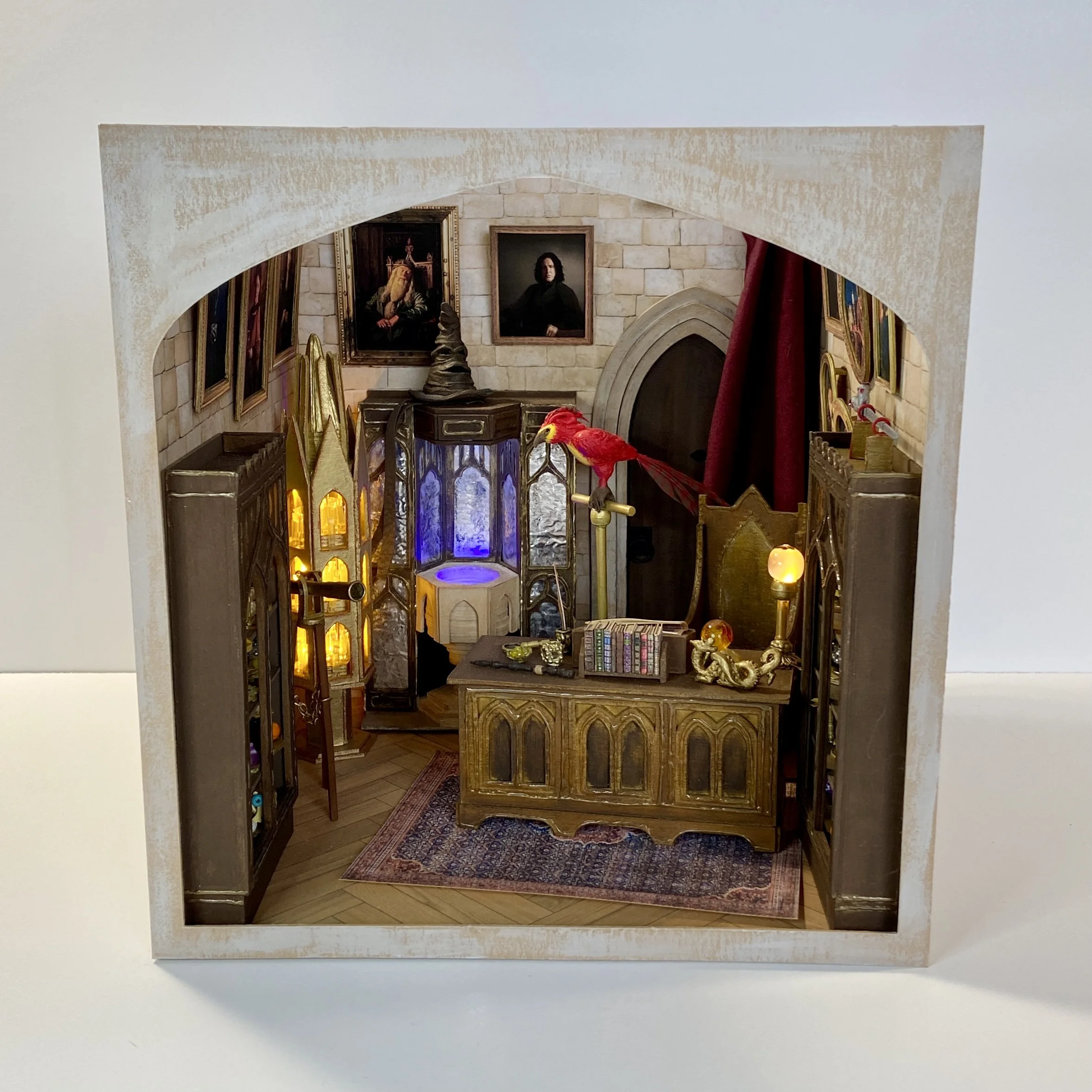 Materials: Chipboard, card stock, LEDs, resin, polymer clay, beads, fabric, acrylic paint