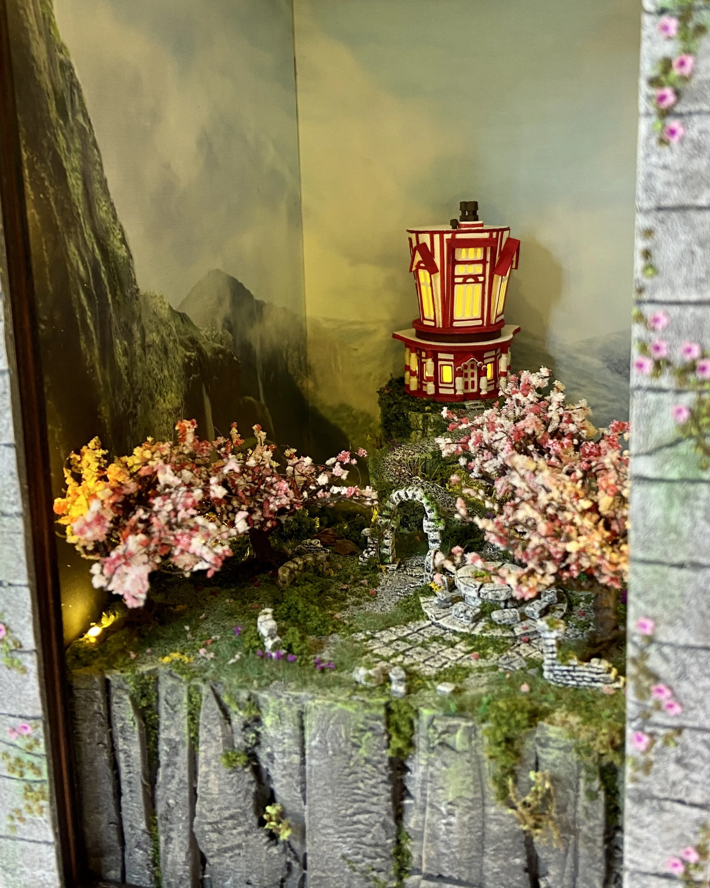 Materials: Wood, chipboard, card stock, paper, foam sheet, acrylic paints, LEDs, fabric, beads, Cosclay polymer clay, Woodland Scenics turfs and bushes