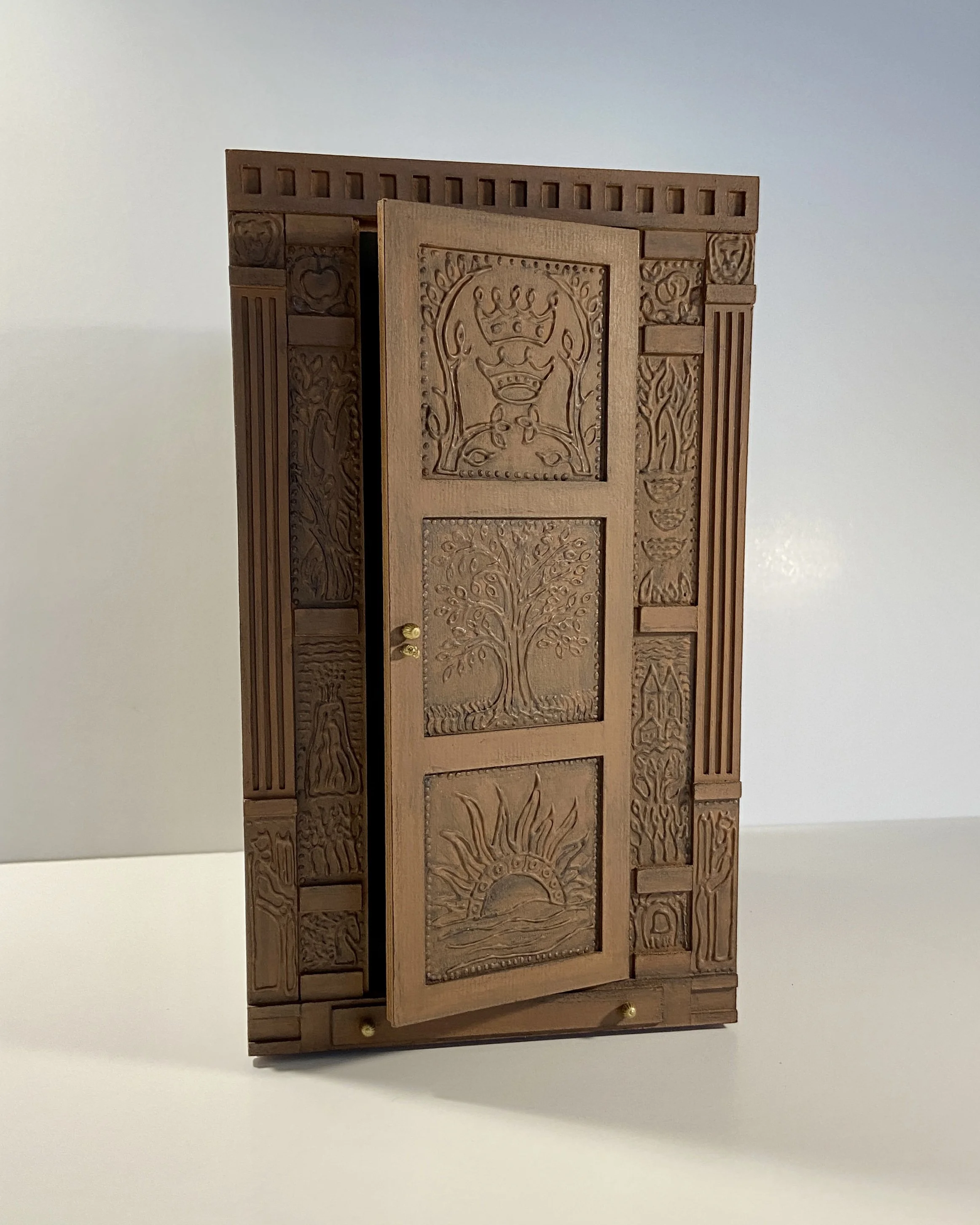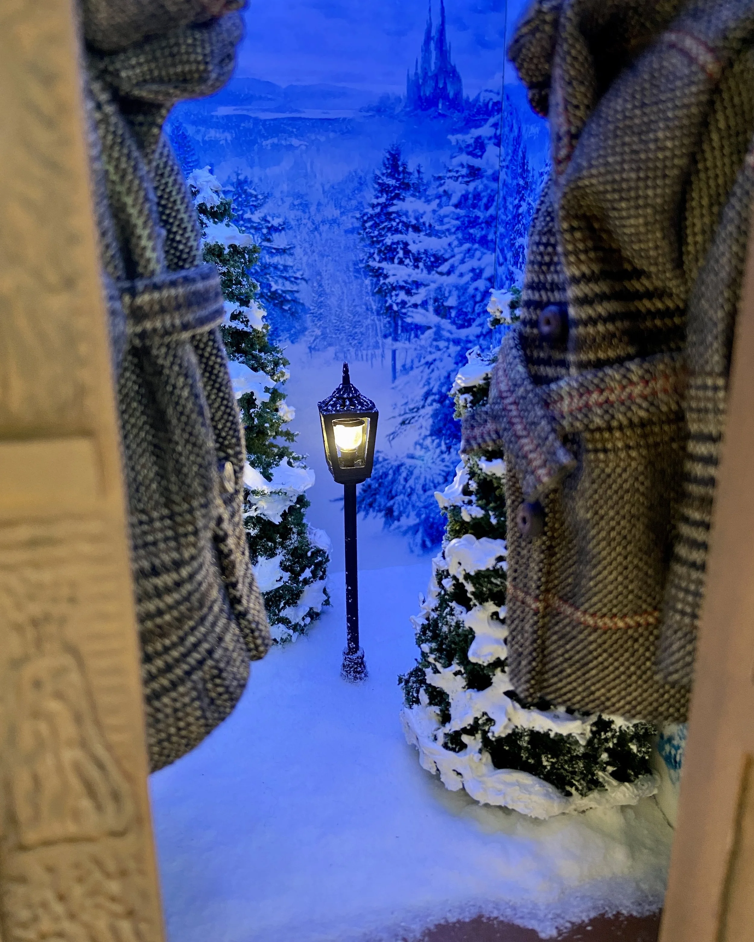 Materials: Wood, XPS foam, chipboard, card stock, acrylic paints, LEDs, artificial snow, fabric