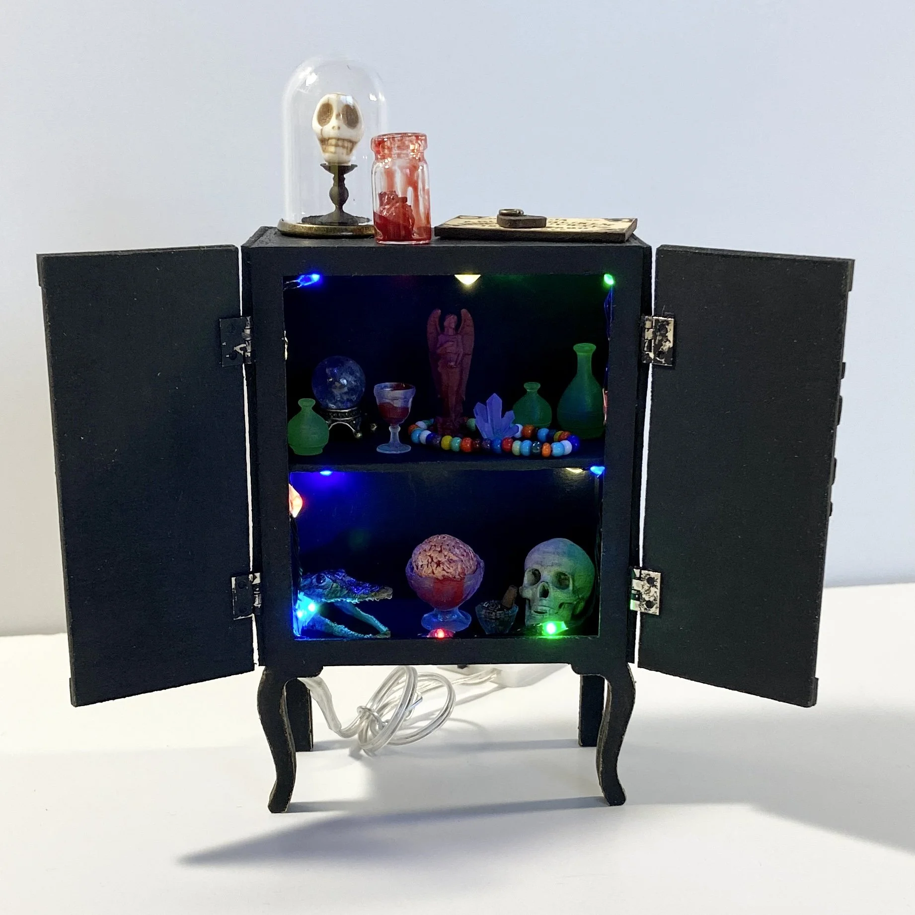 Materials: Chipboard, card stock, brass hinges, resin, beads, real animal bones from owl pellets, LEDs, acrylic paint